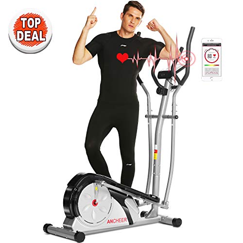 ANCHEER Elliptical Machine Trainer Magnetic Smooth Quiet Driven with LCD Monitor and Pulse Rate Grips (Silver)