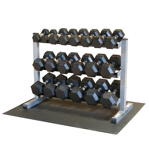 Body Solid GDR363-RFWS Package. Keep your workout area organized, clean and, most importantly, safe. Our weight trees and dumbbell racks can be placed against any wall or centered in a room. Nobody builds stronger or more space efficient storage units. Heavy gauge steel with all-4-side welded construction is deburred inside and out for user safety. Holds one (1) pair each of 5-50 lb. hex dumbbells. Package includes GDR363 3 Tier Horizontal Dumbbell Rack, SDRS550 5-50 lb set of Rubber Dumbbells, and RF34B Rubber Equipment Mat. Freight itemThis package from Body-Solid includes everything you need to get started training with free weights, including a dumbbell rack, complete set of dumbbells, and a rubber mat to place it all on.