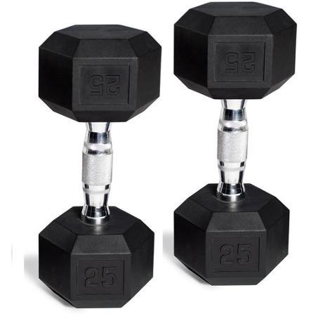 Get a satisfying and effective workout using CAP Barbell Rubber-Coated Hex Dumbbells. Sold in pairs, they come in a range of weights from 5 to 50 lbs per dumbbell. Premium and club-quality, they are made of cast iron and coated in rubber to protect the floor when they are set down. This set of two CAP Barbell dumbbells also features easy-to-grip, contoured handles for a comfortable, non-slip hold while you lift and curl. This also helps to reduce fatigue. The hexagon-shaped heads prevent them from rolling, making them easier and safer to store. These cast iron dumbbells make a suitable addition to either a home gym or one open for public use or club members. The weight is clearly marked on each dumbbell.