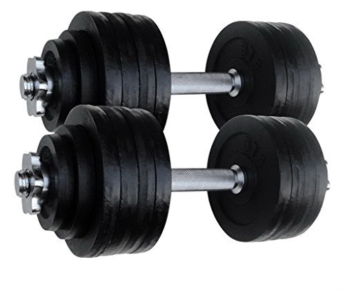 THE DETAIL This set is designed for high-performance comfort with ergonomic grips, handles & safe heavy duty collars. This set includes – TWO (2) durable 15 inches solid steel textured chrome dumbbell handles provide a sure comfortable grip – 5 lbs total – FOUR (4) threaded collar design provides for safe and easy plate changes. – SIXTEEN (16) 5.0-lb plates – FOUR (4) 2.5-lb plates – FOUR (4) 1.25-lb plates – TOTAL WEIGHT of the set 2×52.5 lbs = 105 lbs: You can set up to 52.5 lbs per side or any 2.5 lbs increment combo from 5 lbs to 52.5 lbs