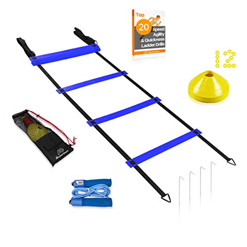 - ✔️COMPLETE TRAINING SET – Included an Agility Ladder (20 feet 12 rung with 4 metal pegs), 12 Training Cones, a Speed Jump Rope, a custom Carry Bag and an e-Book. Ideal for all atheletes to improve speed, endurance, balance, footwork, quickness, leg strength and overall coordination.